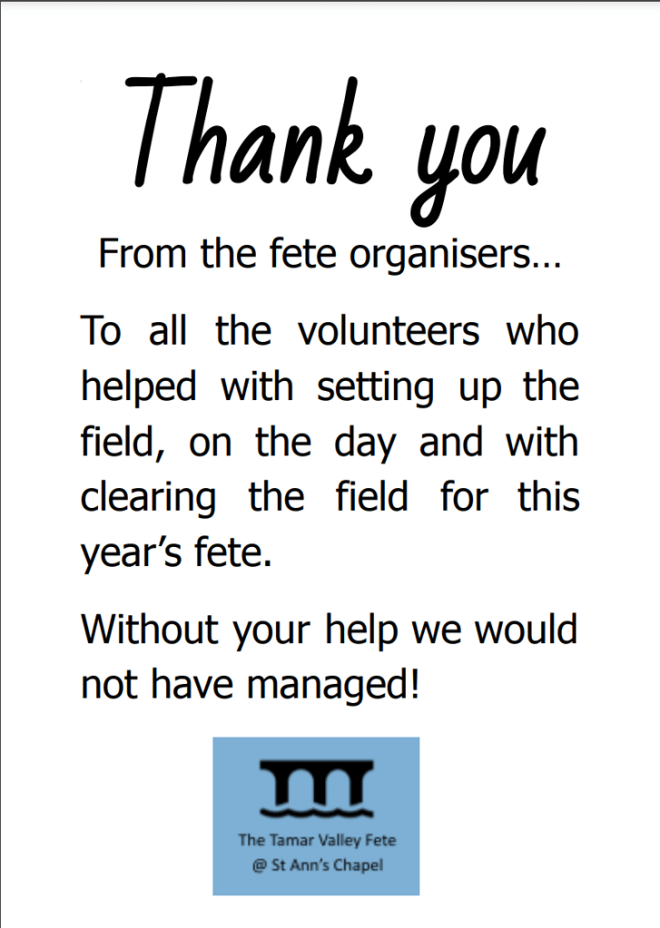 The Tamar Valley Fete started as the St Ann’s Chapel Platinum Jubilee celebration in 2022. Following the success of this event, the committee decided to make it an annual event and bring in some new voices to contribute to the day.
